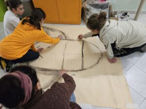 Il Laboratorio teatrale di Porto Torres, si sta per concludere, con l’esito scenico del 15 aprile davanti ad un pubblico di studenti ed insegnanti della scuola stessa; il laboratorio ha visto la partecipazione dell’intera classe, la II C, senza nessuna esclusione. Una parte del laboratorio è stata dedicata ai colori e alla scoperta del linguaggio pittorico in forma libera e creativa, un’altra, svolta contemporaneamente, è stata rivolta alla creazione del gruppo attraverso giochi teatrali di relazione, di contatto e di movimento utili a sviluppare un ambiente libero e creativo. L’esito scenico è il risultato del lavoro degli studenti, che hanno inventato una storia con protagonisti due ragazzi, Kalim e Clara. Si é partiti dalla realizzazione di un fumetto, base per il copione:  due giovani, Kalim che vive nel passato in un villaggio della Sardegna preistorica e Clara che vive nel tempo odierno a Porto Torres si trovano in una domus e affrontano una serie di avventure, in cui due mondi così lontani nel tempo si incontrano, un ragazzo catapultato nel presente dalla preistoria, l’altra che vive la realtà odierna; scoprono la loro affinità e consanguineità e comunicano abbattendo la barriera temporale. Qual é il messaggio proveniente dal passato? le prove da superare per sopravvivere nella scena assumono il significato universale delle difficoltà della vita che ogni essere umano, in particolare adolescente, deve superare possibilmente con l’aiuto della comunità.