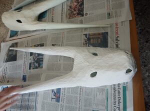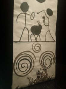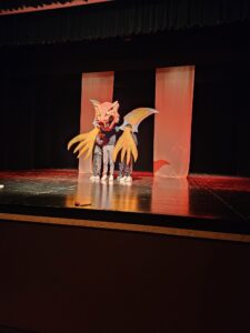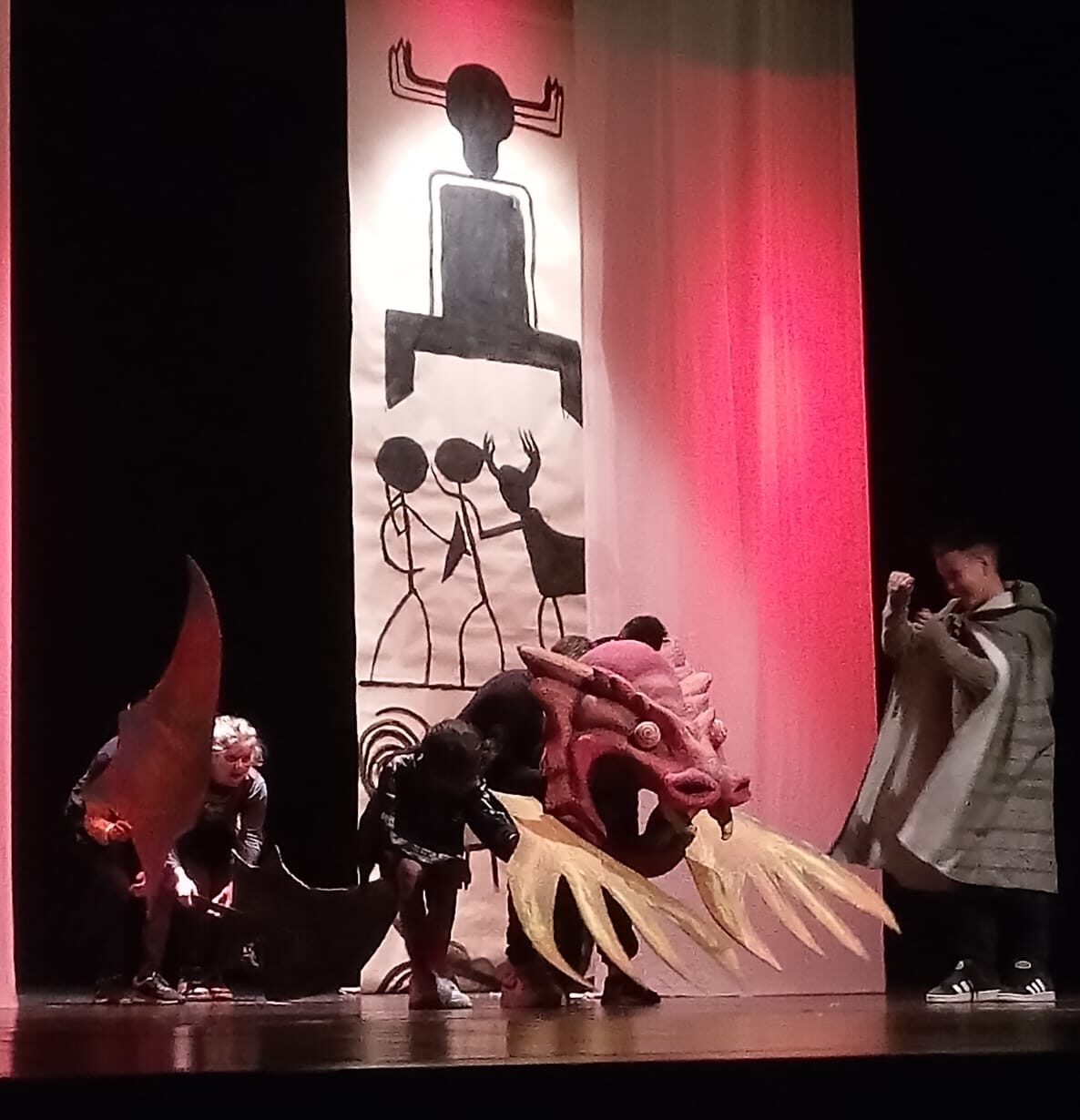 Prendono vita i mostri, creati dalla fantasia dei ragazzi e da loro realizzati; si presentano allo spettatore una grande protome taurina e un drago alato con enormi artigli, che fanno apprezzare anche il lavoro artistico e pittorico che per diversi mesi ha impegnato il gruppo. Sottolineate dalla musica e dai rumori, le apparizioni sono emozionanti e rappresentano il momento culminante dello spettacolo. Le conoscenze acquisite nel corso del progetto sui monumenti della Preistoria ispirano liberamente anche le figure dipinte su una suggestiva scenografia, con  giochi di luci colorate, che rievocano “i colori dell’eternità” del titolo del progetto. Tutti sono protagonisti, tra personaggi e narratori ci sono parti per tutti i componenti della classe. Il clima che si respira alle prove è di grande impegno, ma anche di condivisione e divertimento. Complimenti.