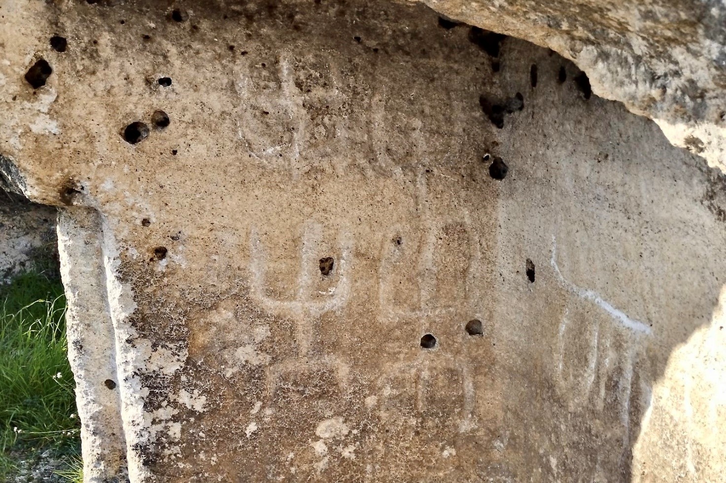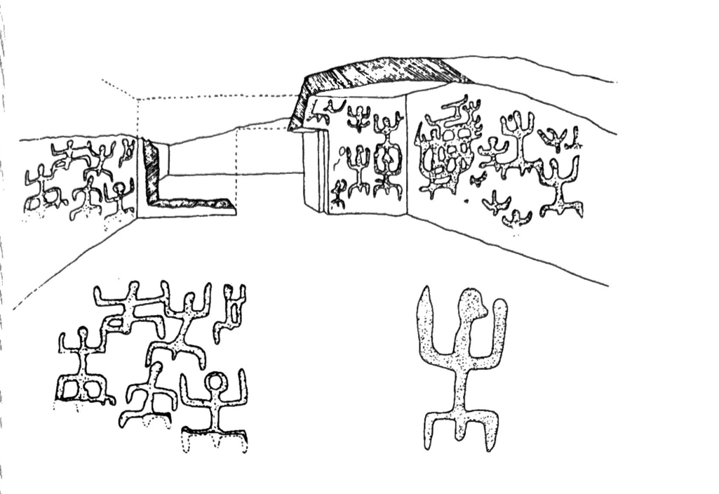 I petroglifi della Tomba Branca: vi sono tre gruppi di rappresentazioni filiformi schematiche antropomorfe databili tra il 3500 e il 2500 a.C.; sulla destra sono visibili in modo chiaro le incisioni, mentre sulla sinistra sono quasi interamente scomparse ed è possibile vederle solo in alcuni momenti della giornata, quando il sole sta per tramontare. Probabilmente dovevano essere presenti anche sulla parete che oggi non c’è più. Le figure, tutti personaggi maschili, con le braccia sollevate nel linguaggio internazionale rappresentano gli oranti, uomini in preghiera, e sono disposti l’uno sopra l’altro: quello più in alto sembra abbia in mano un oggetto (forse un’accetta), il secondo, quello in basso è raffigurato di profilo e ha un grande naso, come la figura che è al suo fianco e si è ipotizzato che si possa trattare di una maschera. La scena potrebbe raffigurare dei giochi funebri in onore dei defunti, mentre le figure poste in cerchio alluderebbero a possibili danze. E’ importante sottolineare che queste incisioni si trovano nel corridoio della tomba, dove si pensa venissero espletati i riti funerari, quindi le incisioni sono connesse ai riti e alla pratiche funerarie, con una forte valenza simbolica. Oggi con i nuovi programmi informatici, è stato possibile ricostruire le immagini in 3D, e con accorgimenti speciali in 2D con ottime risoluzioni, e attraverso queste tecnologie sono state individuate anche macchie di colore rosso, forse l’uso dell’ocra; inoltre è stato possibile ricostruire le incisioni più sottili chiamate “incisioni graffite” o “tecnica lineare” e anche capire che tipo di strumenti sono stati usati (strumento metallico se l’incisione è a V, litico molto appuntito se l’incisione è circolare).