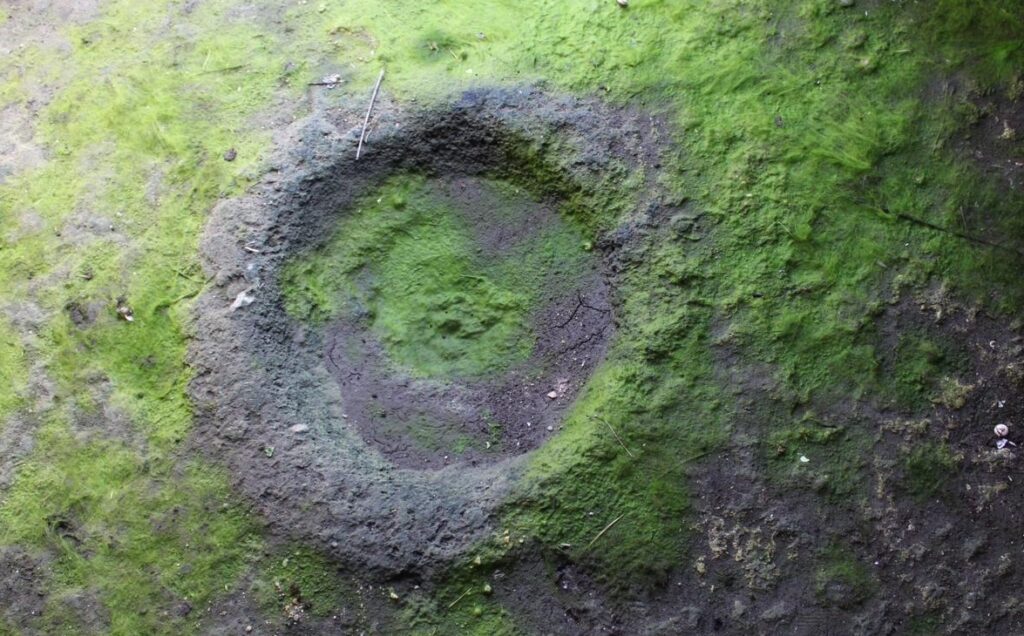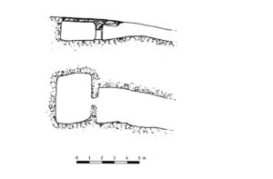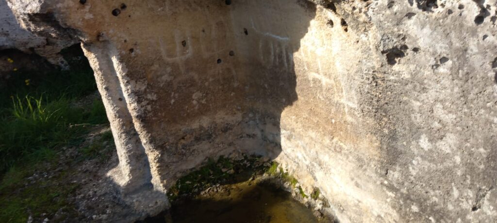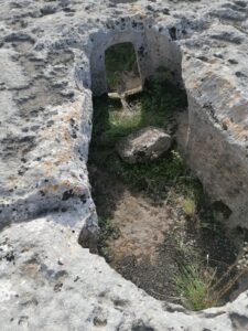 Sempre nella tomba Branca, sul fondo della parete rispetto all’ingresso, al centro, è ancora appena percettibile l’incisione di una “falsa porta” con gli stipiti e sopra l’architrave: di solito la falsa porta è lungo l’asse longitudinale rispetto al dromos, poi si attraversa l’anticella, si supera l’ingresso e sul fondo spesso, ma non sempre si può vedere. Indica il passaggio verso il mondo dei morti, un passaggio percorribile solo da chi è morto.
