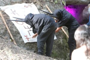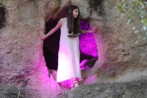 L’esito scenico del laboratorio teatrale di Ghilarza si è svolto il 29 maggio alla necropoli di Ispiluncas di pomeriggio, all’aperto, con le domus illuminate da luci colorate all’interno, in uno scenario suggestivo. Il gruppo, composto da alunni provenienti da classi diverse, ha conosciuto qualche ritiro e non tutti sono stati presenti allo spettacolo finale. Parte del laboratorio è stato dedicato alla costruzione di oggetti di scena: maschere di cartapesta e bastoni di legno rivestiti di corda etc. e il lavoro manuale ha permesso l’inclusione di tutti i ragazzi, anche di quelli con difficoltà. Le maschere, elemento suggestivo assai caro alla cultura sarda, sono diventate strumento scenico e indossate da alcuni attori, che hanno sperimentato come il nascondimento dietro le maschere è liberatorio e contribuisca ad acquisire una maggiore sicurezza di sé. Durante le prove il clima è stato collaborativo e di grande partecipazione. Il laboratorio teatrale, assieme alle escursioni, è stato considerato il momento più bello dell’intero percorso progettuale. Durante lo spettacolo i giovani attori e le giovani attrici hanno anche cantato canzoni rap da loro composte, assieme agli studenti liceali, e sono stati divisi in tre gruppi: i narratori, le Janas e i custodi. La suggestione delle leggende sulle misteriose Janas, protagoniste di tante storie che ci offre la tradizione popolare della Sardegna, è stato il fil rouge dello spettacolo, in cui hanno trovato spazio anche i testi scritti dai ragazzi e rielaborati dalle attrici e registe de “Le voci di Astarte” Sabrina Barlini e Gloria Uccheddu. Semplici i costumi, con materiale riciclato ed oggetti reperiti nelle famiglie in modo da creare una continuità fra la preistoria e la tradizione rurale sarda. Anche i teli realizzati dai ragazzi durante un anno di lavoro sulle diverse necropoli visitate hanno avuto un ruolo introduttivo allo spettacolo, appesi agli alberi come in un lungo dromos a testimonianza del percorso realizzato.
